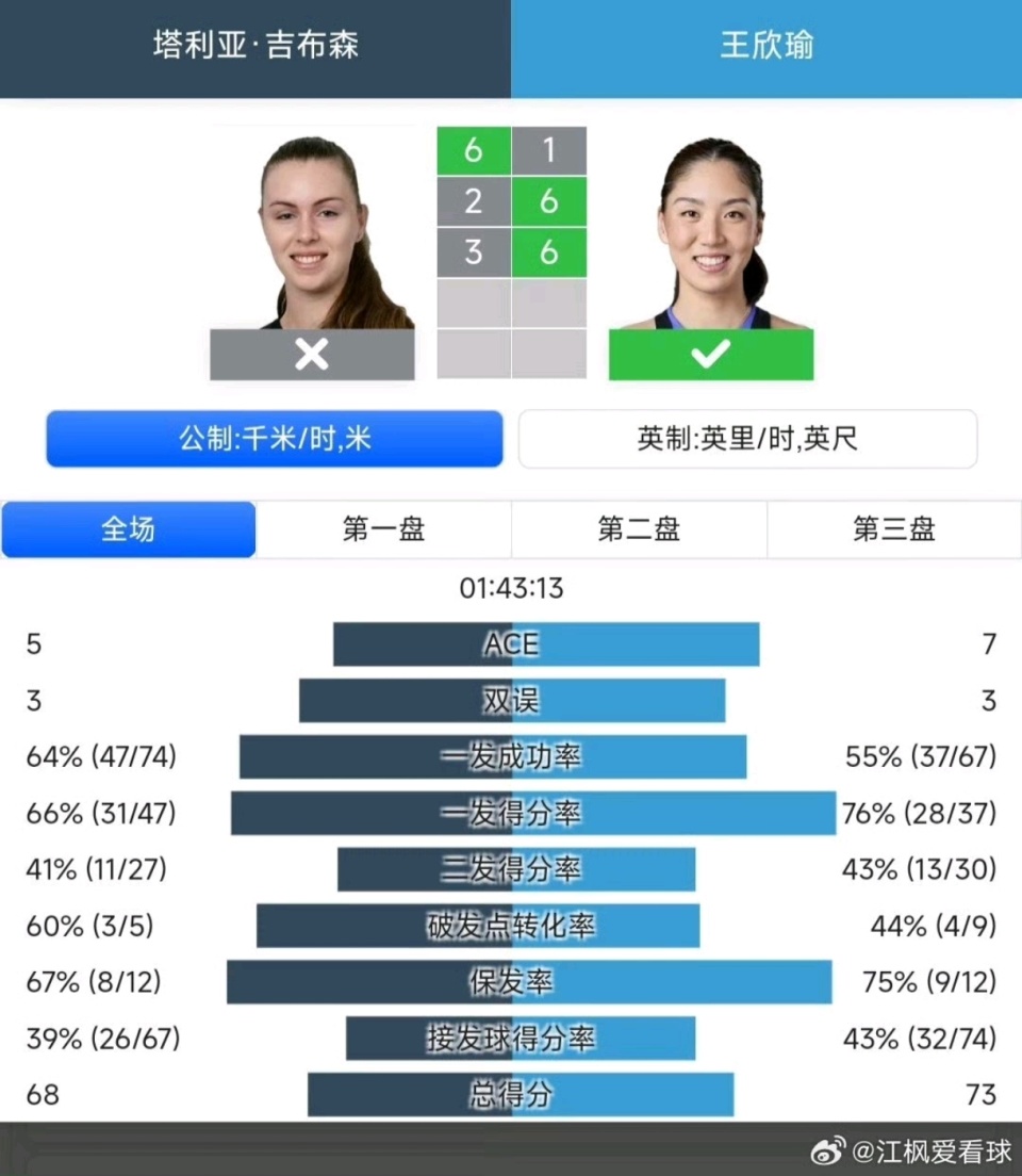 不过第二盘,王欣瑜迅速调整,6-2扳平,随后比赛因为下雨而推迟。原本将在北京时间昨晚继续进行,但再度因为下雨推迟,直到今天凌晨才打完决胜盘。